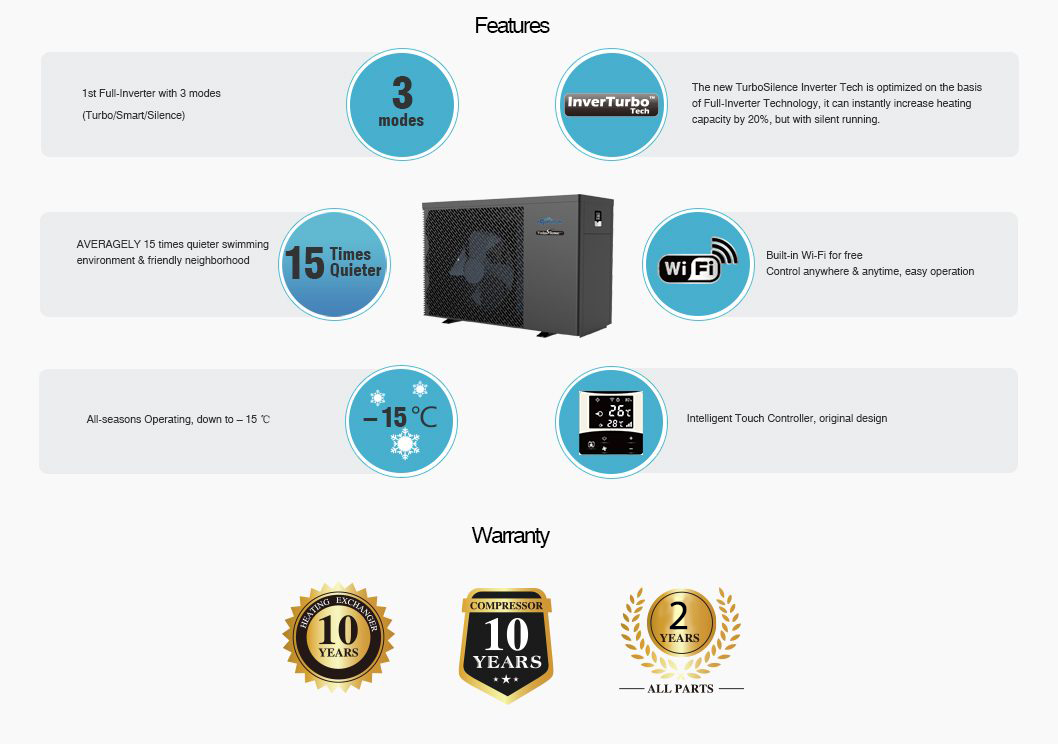 The "Turbo" function of the twin Mitsubishi brushless compressors gives an average of 20% improvement in performance and helps reduce overall running costs of your pool heating system.