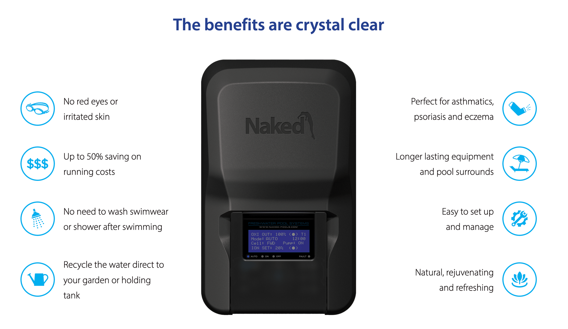 A breakthrough system by Naked Pools can safely and effortlessly purify your pool water without need for adding chlorine, high salt or minerals.