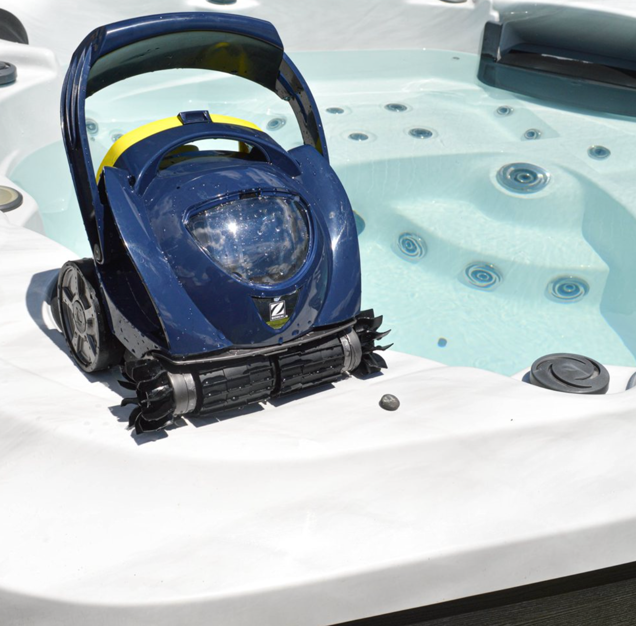 Zodiac® SPABOT™ is the first ever hands-free, cord-free robotic cleaner designed for home spas. It features SPANAV™ technology that helps the SPABOT™ to maneuver around the seats and small confines of the spa. It dips and dives, crawls and climbs to get itself around to clean floor, seats and waterline of the spa.